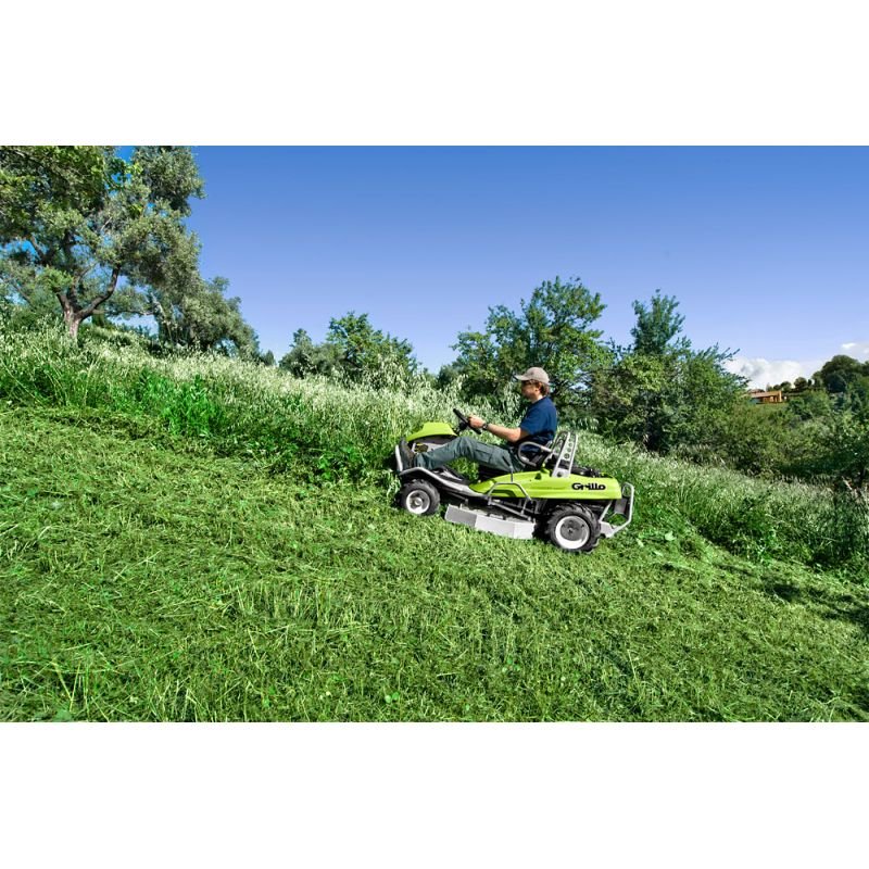 Avec son essieu avant basculant et ses roues à profil agraire, elle assure une excellente adhérence et traction sur les terrains accidentés. Son rayon de braquage de 45 cm permet d’éviter facilement les obstacles. Le plateau de coupe à une lame a une largeur de 85 cm.
